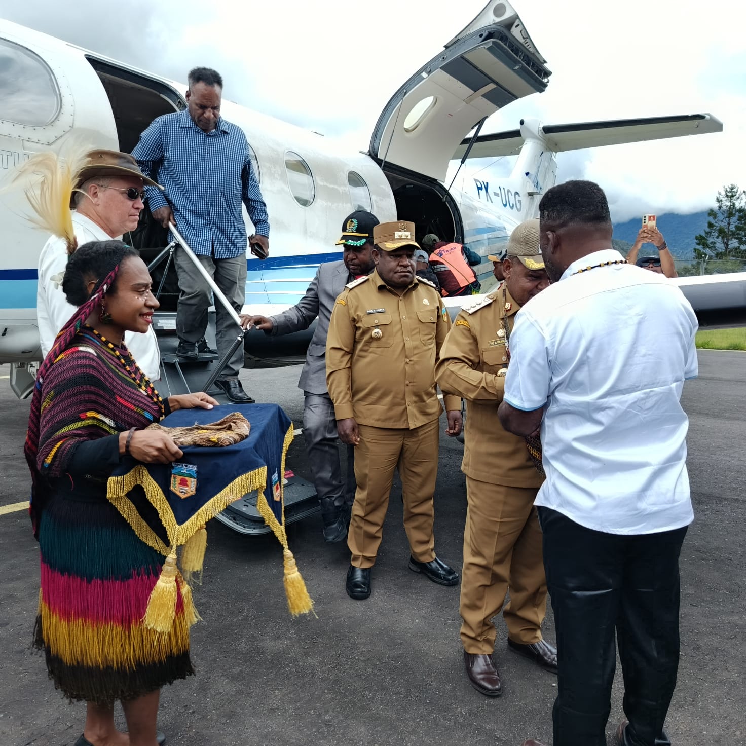 Acara penjemputan di Bandara Mulia, disambut langsung oleh plt. Sekda Yubelina Enumbi dan didampingi oleh para pejabat eselon II, III, IV serta ASN dan simpatisan Masyarakat Kabupaten Puncak Jaya. Ketua Tim Kualisi Amanah Roman Telenggen