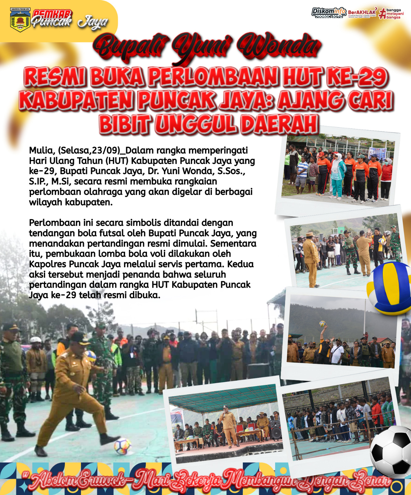 Mulia, (Selasa,23/09)_Dalam rangka memperingati Hari Ulang Tahun (HUT) Kabupaten Puncak Jaya yang ke-29, Bupati Puncak Jaya, Dr. Yuni Wonda, S.Sos., S.IP., M.Si, secara resmi membuka rangkaian perlombaan olahraga yang akan digelar di berbagai wilayah kabupaten.