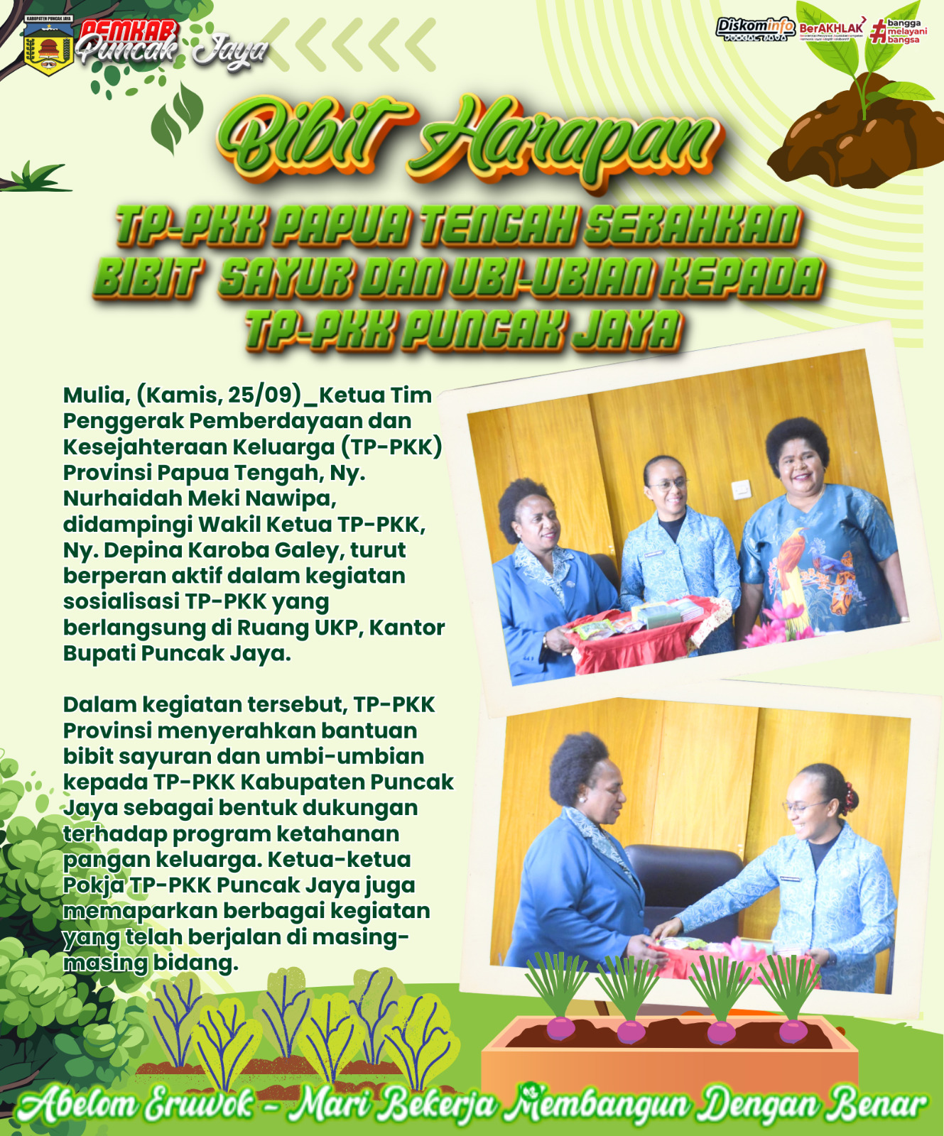 BIBIT HARAPAN TP-PKK PAPUA TENGAH SERAHKAN BIBIT SAYUR DAN UBI-UBIAN KEPADA TP-PKK PUNCAK JAYA